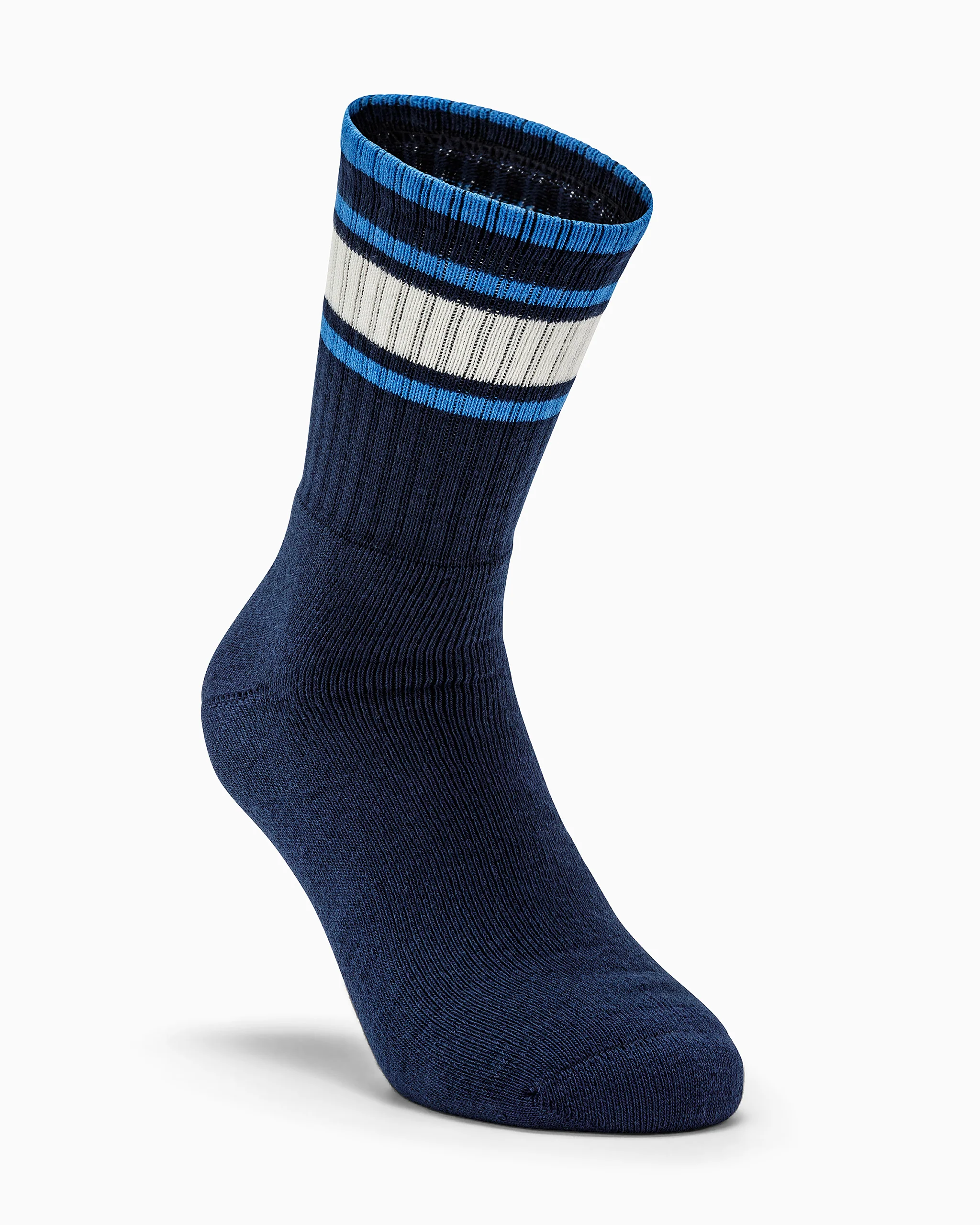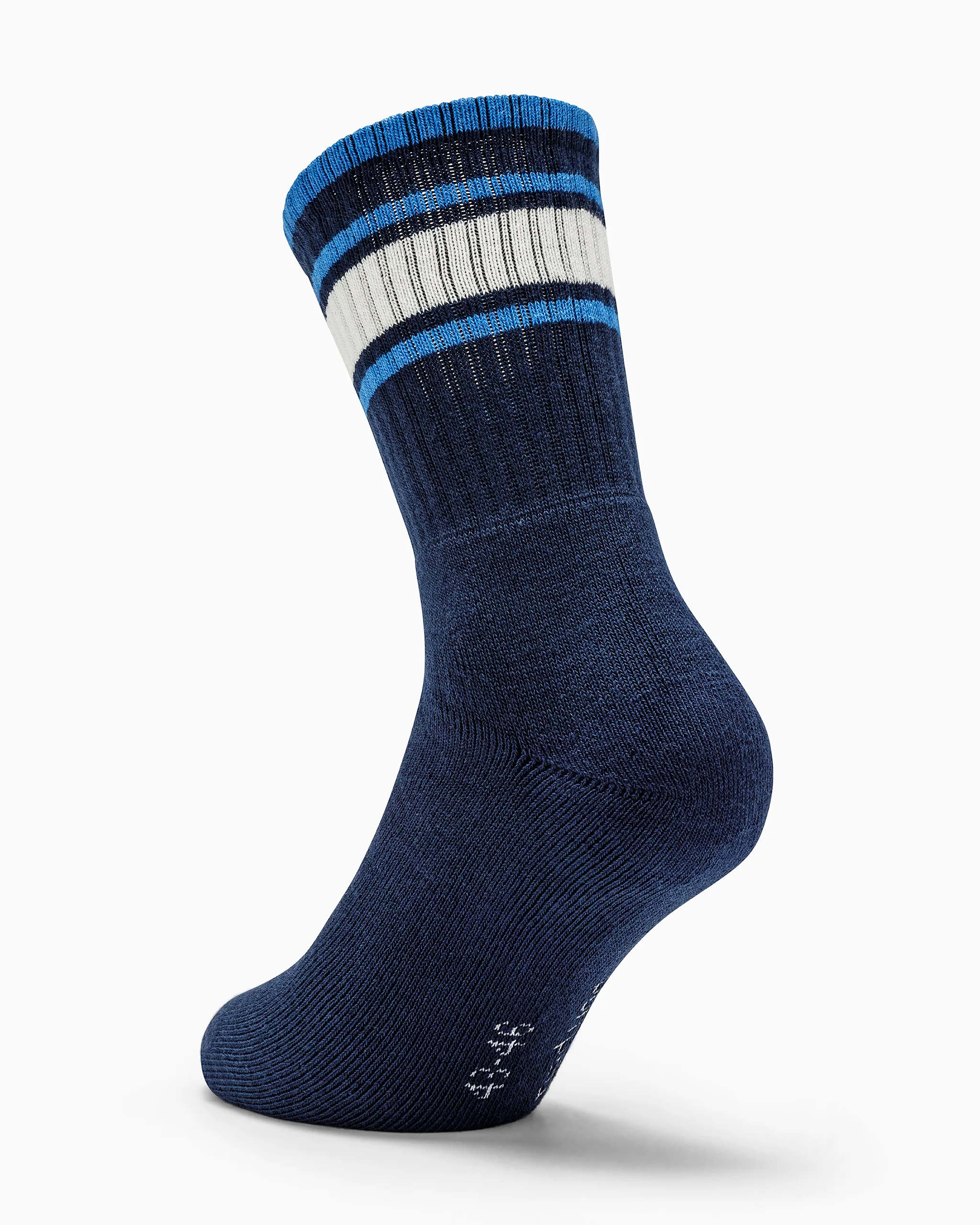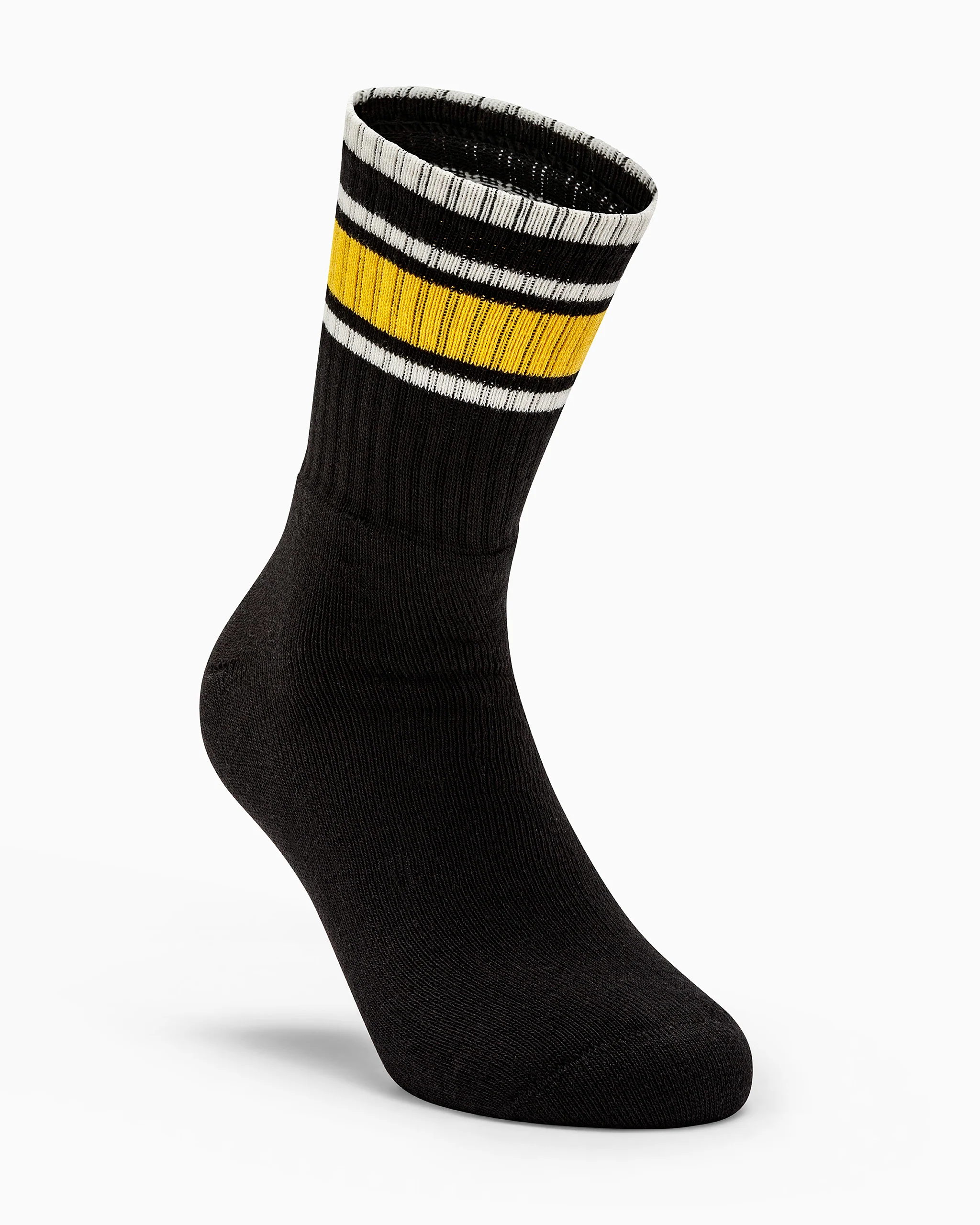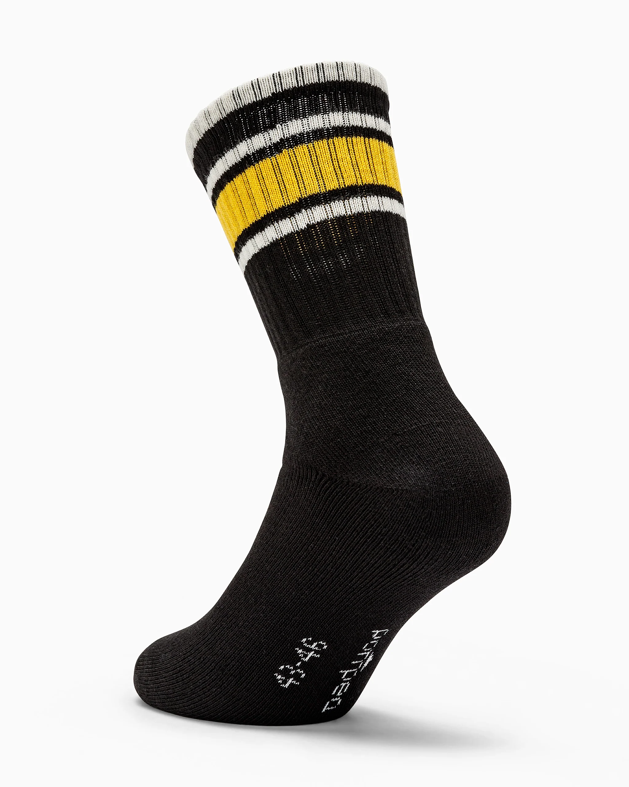 Șosete de tenis pentru bărbați, confecționate din bumbac, cu un model de dungi plasate pe fond negru.